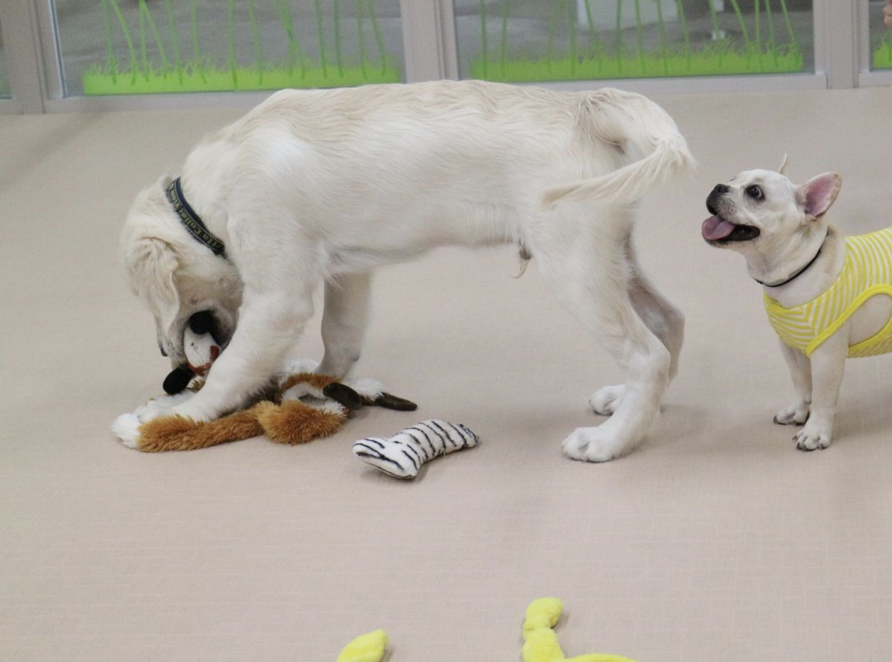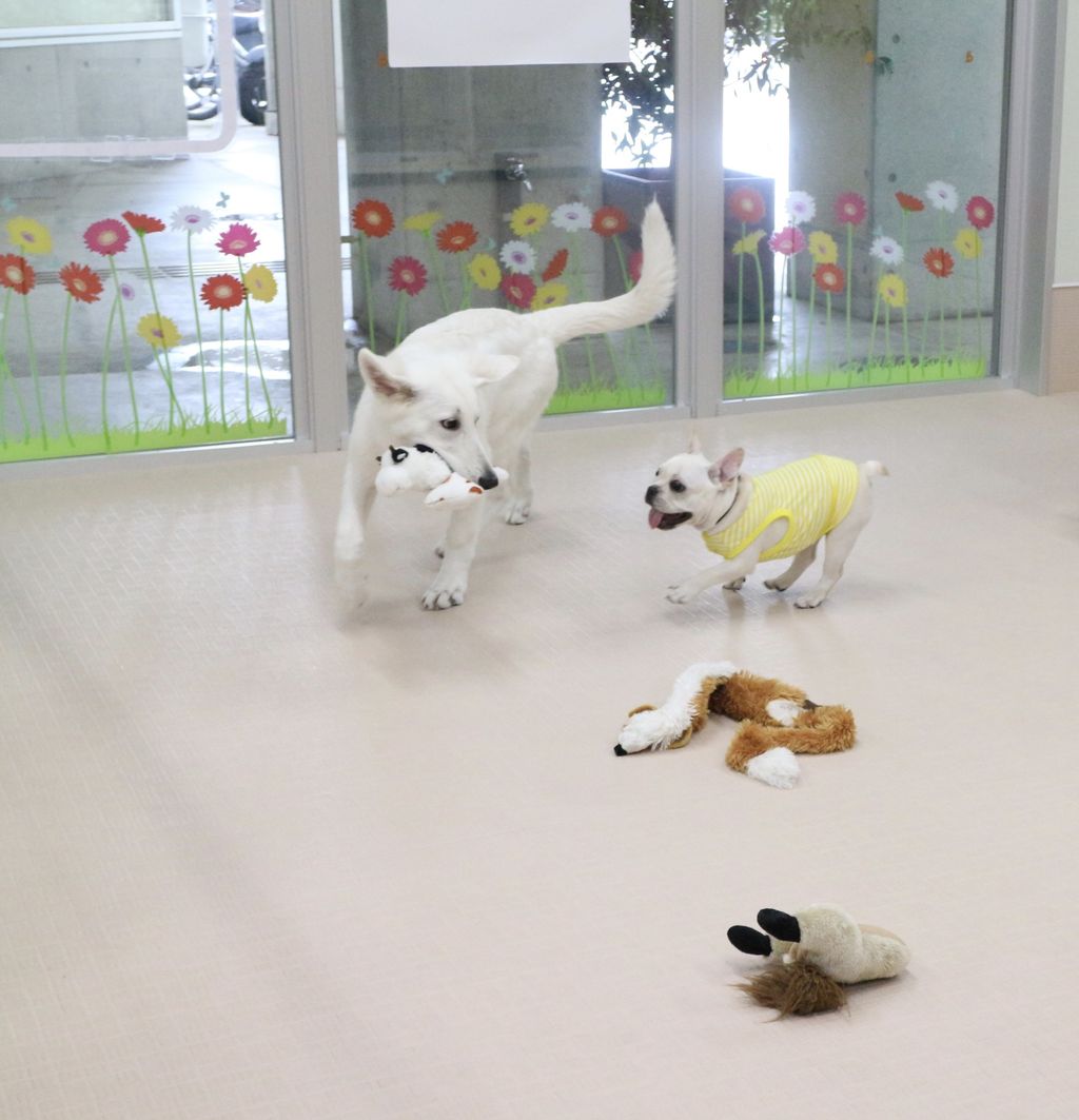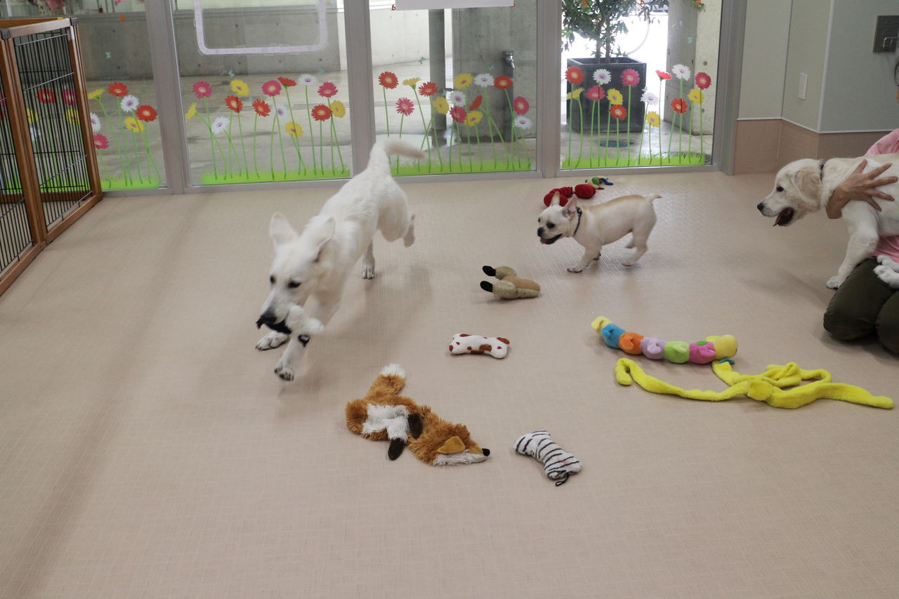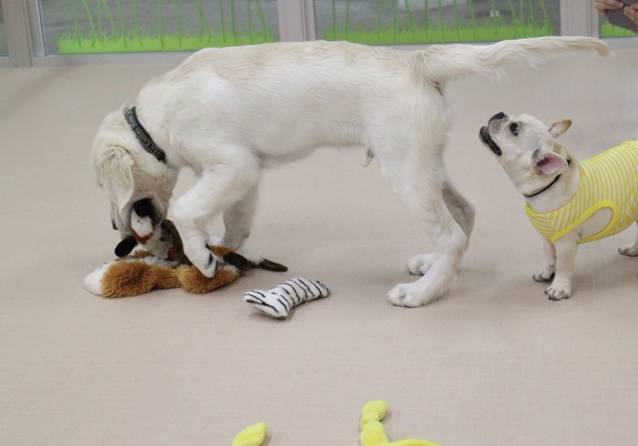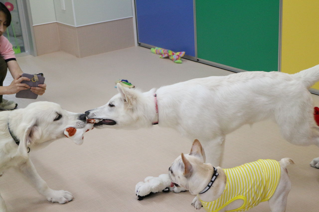 まずはスタッフが慎重にお互いのご挨拶をリードします。よし、大丈夫と判断して初めて一緒に遊ばせます。