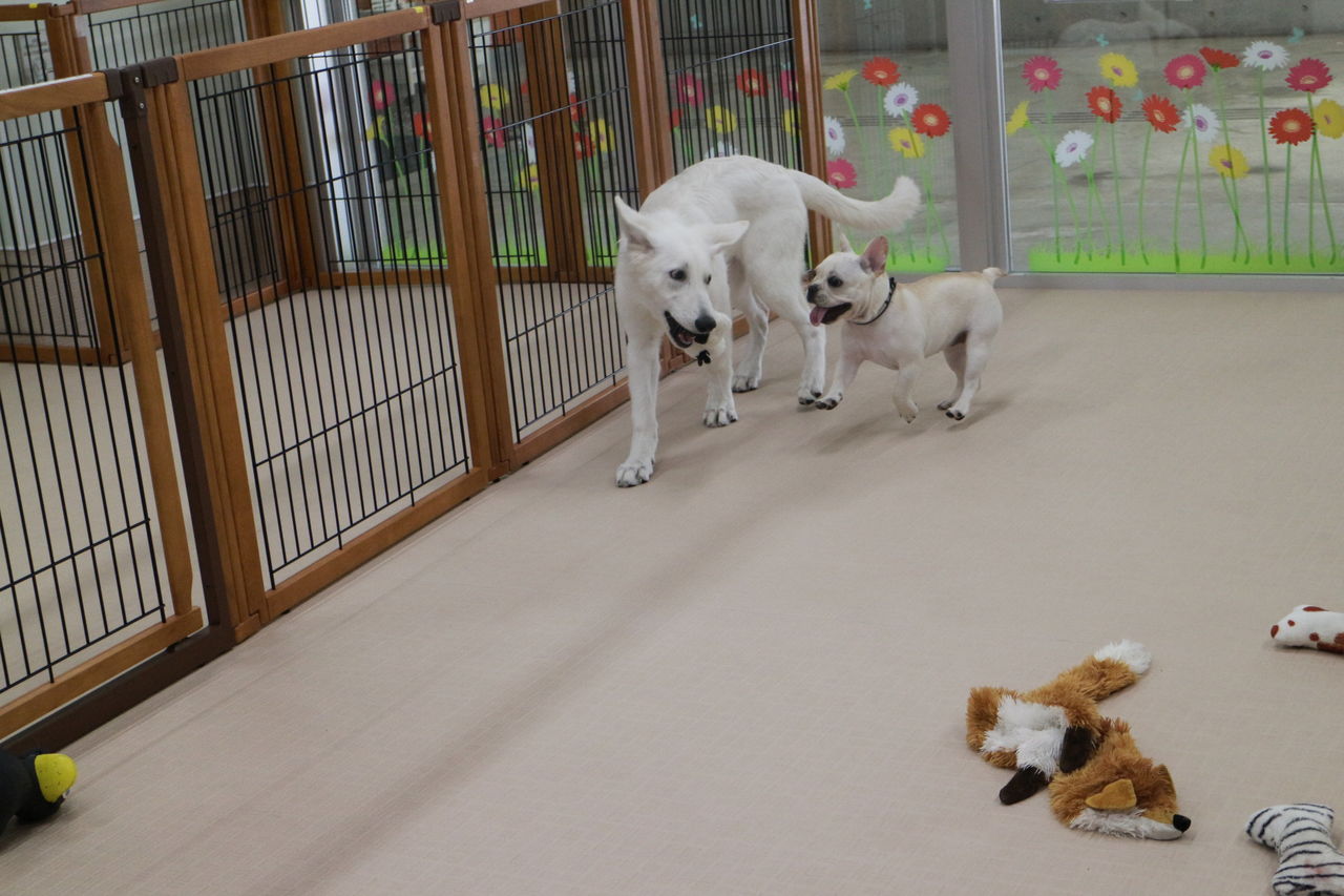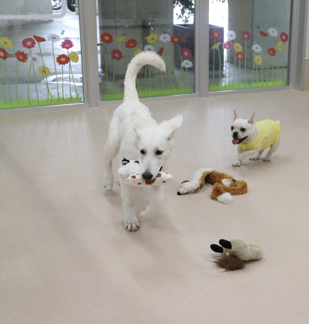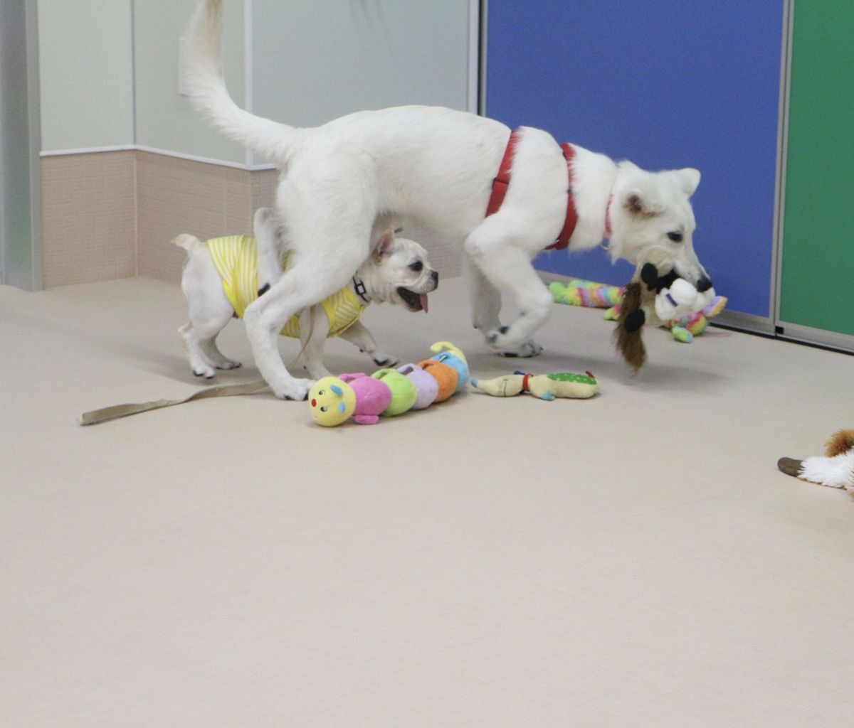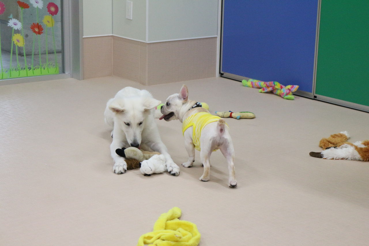 まずはスタッフが慎重にお互いのご挨拶をリードします。よし、大丈夫と判断して初めて一緒に遊ばせます。
