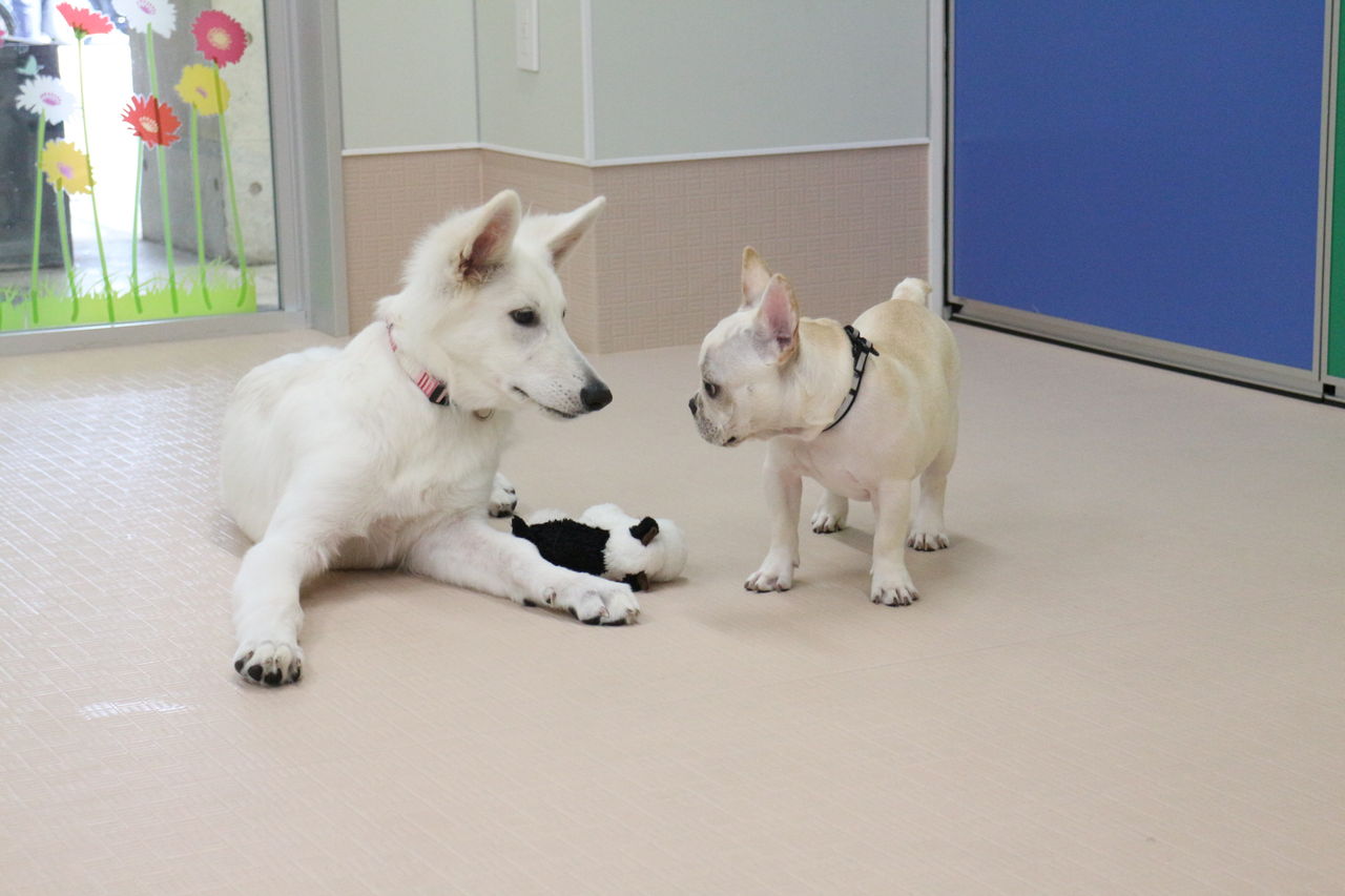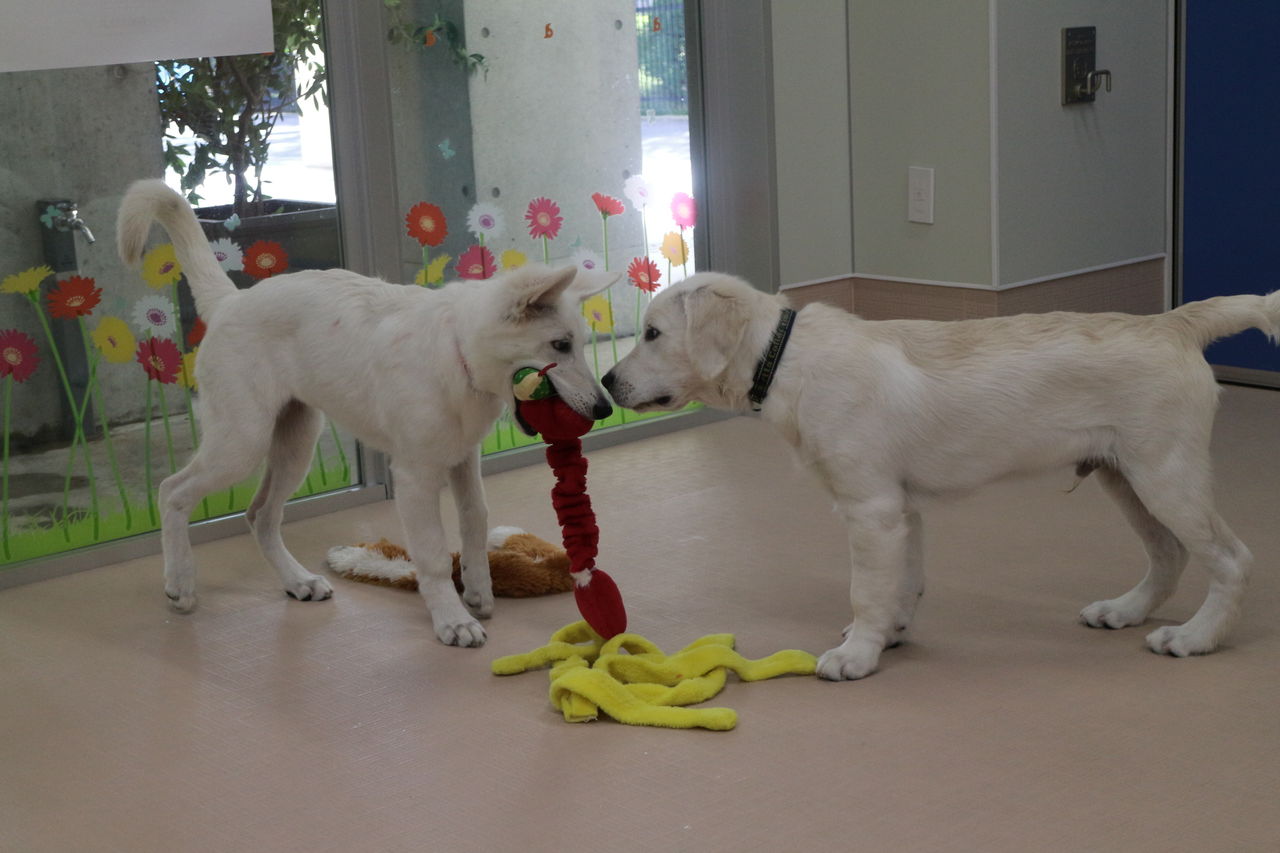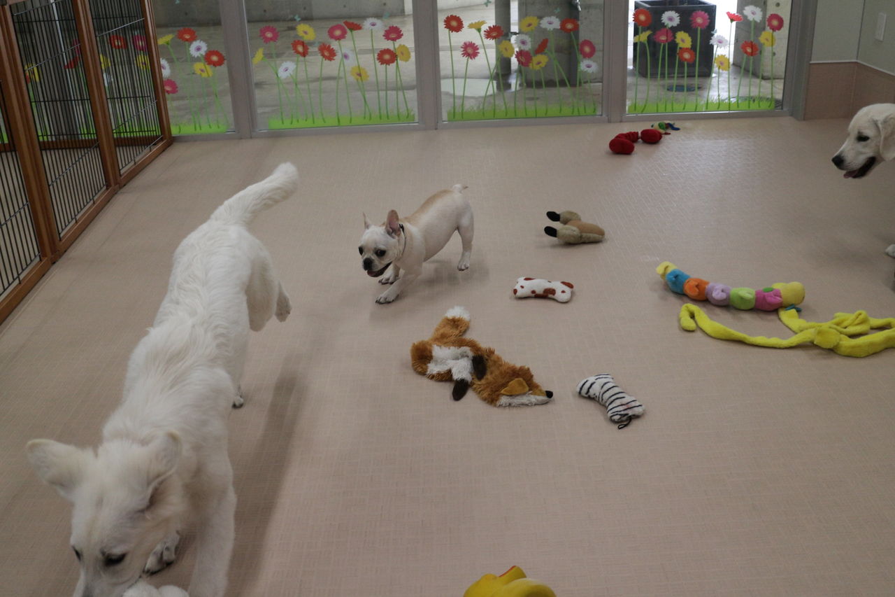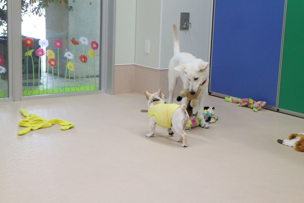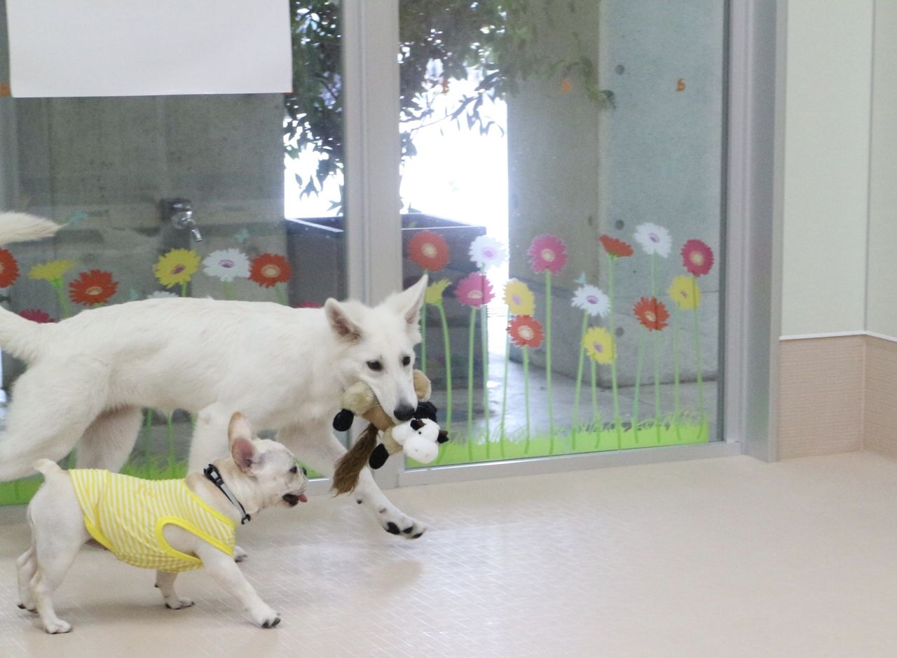 まずはスタッフが慎重にお互いのご挨拶をリードします。よし、大丈夫と判断して初めて一緒に遊ばせます。