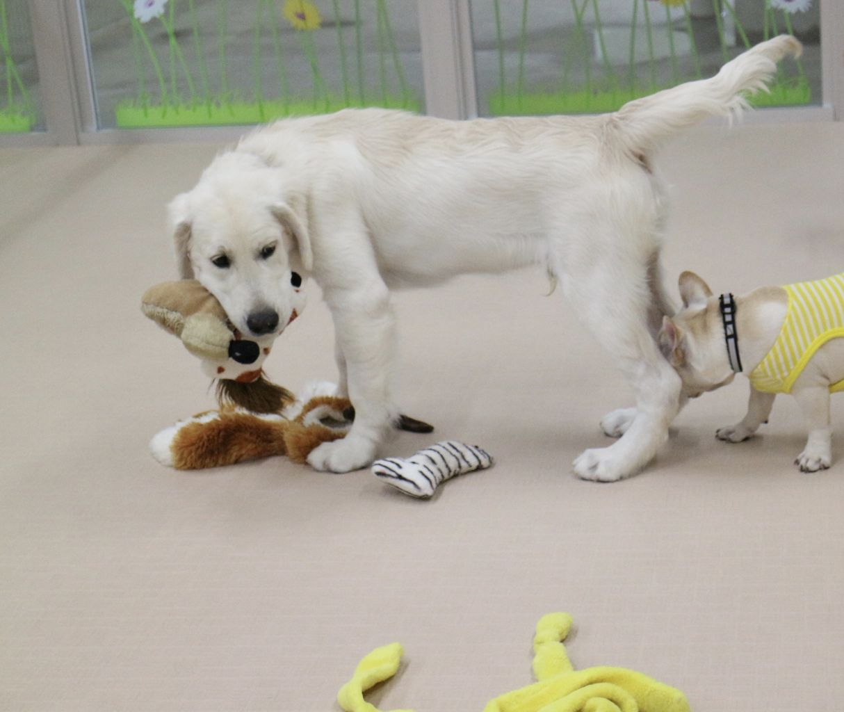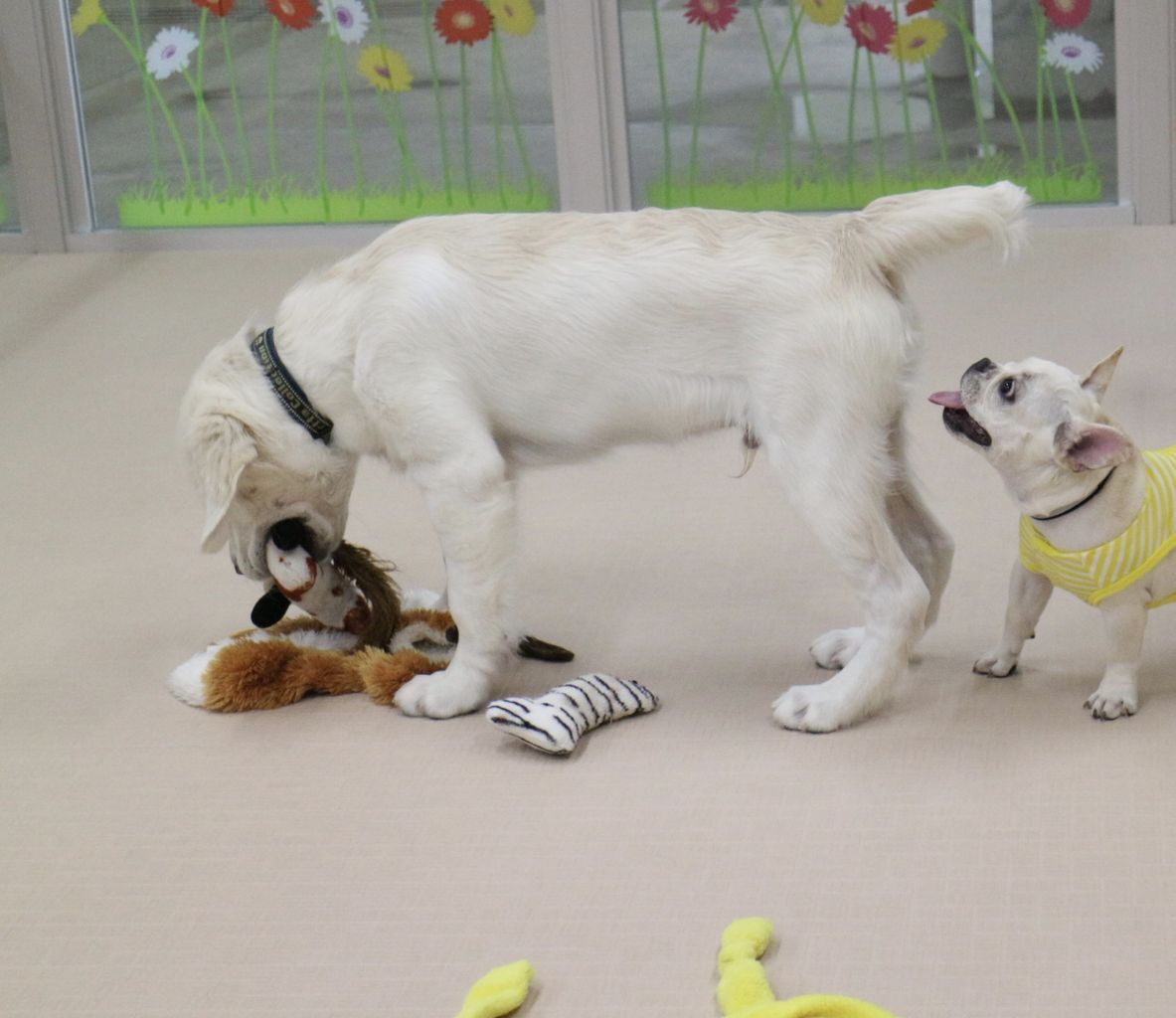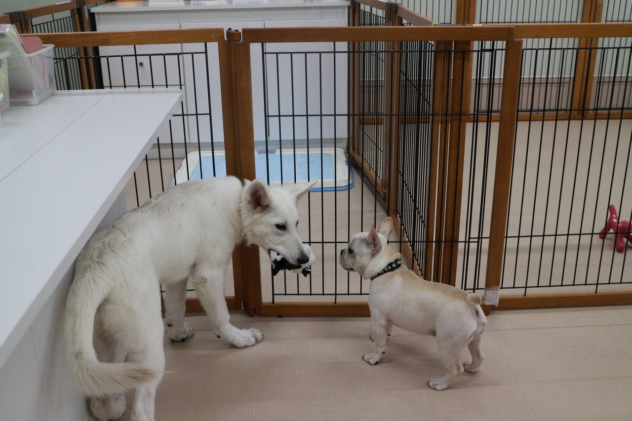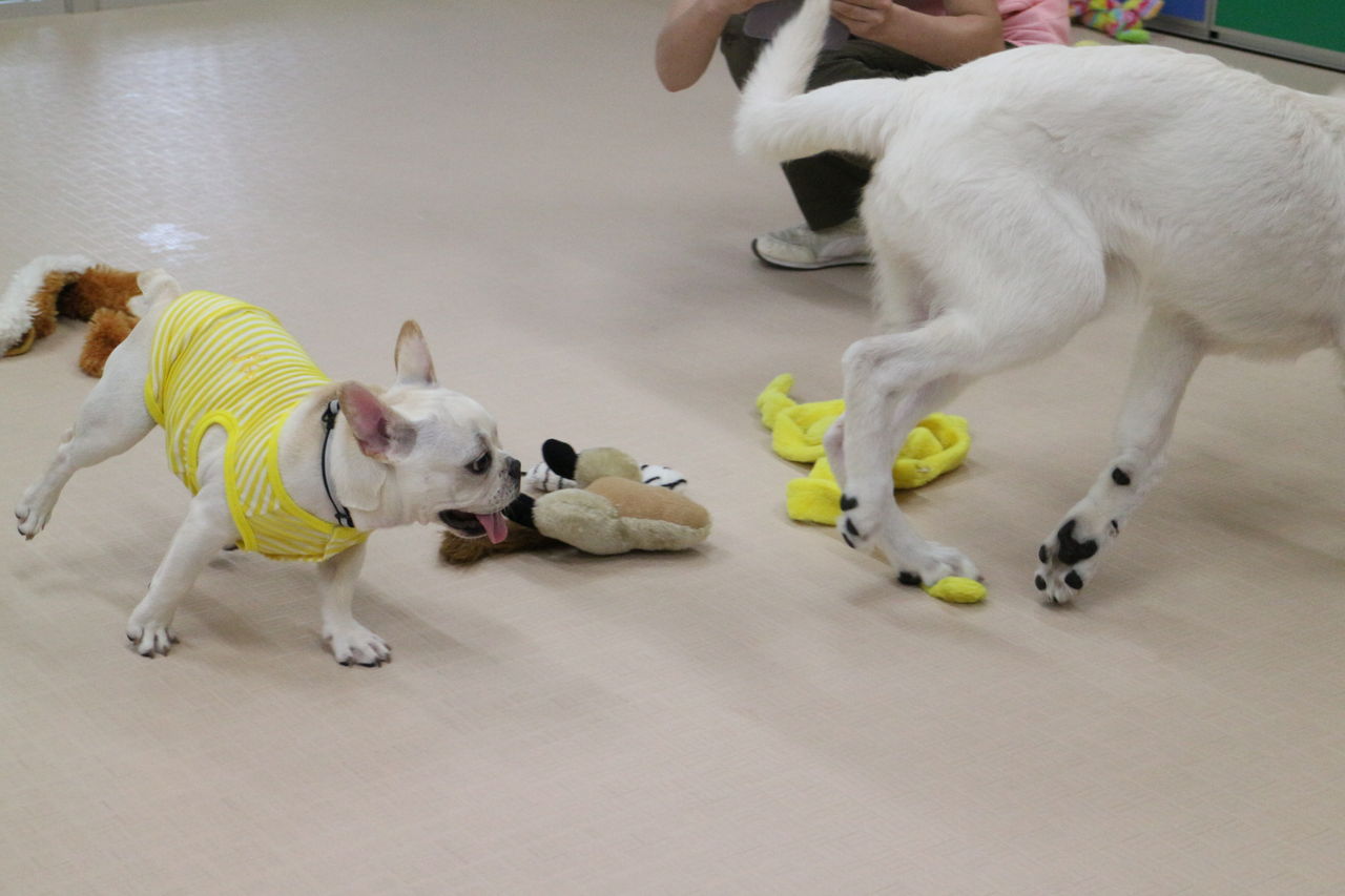 まずはスタッフが慎重にお互いのご挨拶をリードします。よし、大丈夫と判断して初めて一緒に遊ばせます。