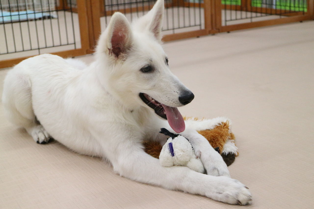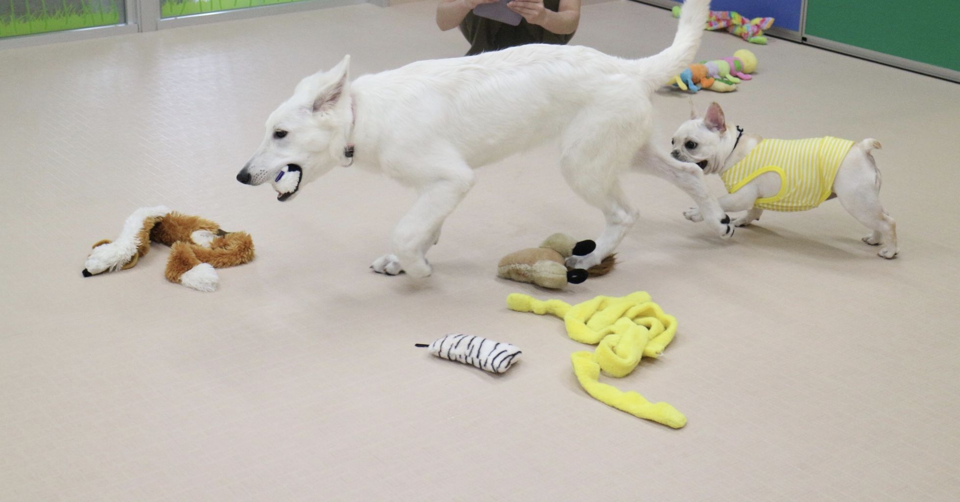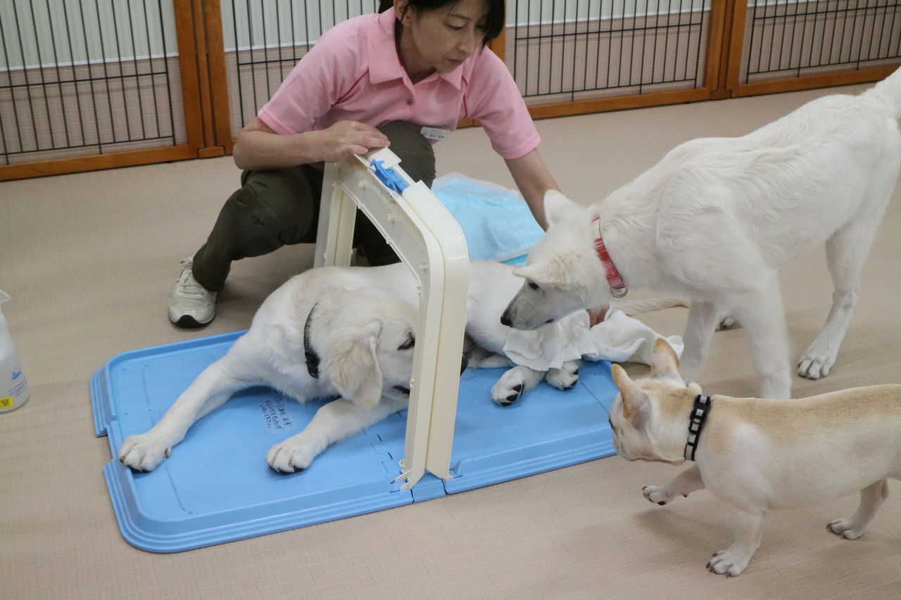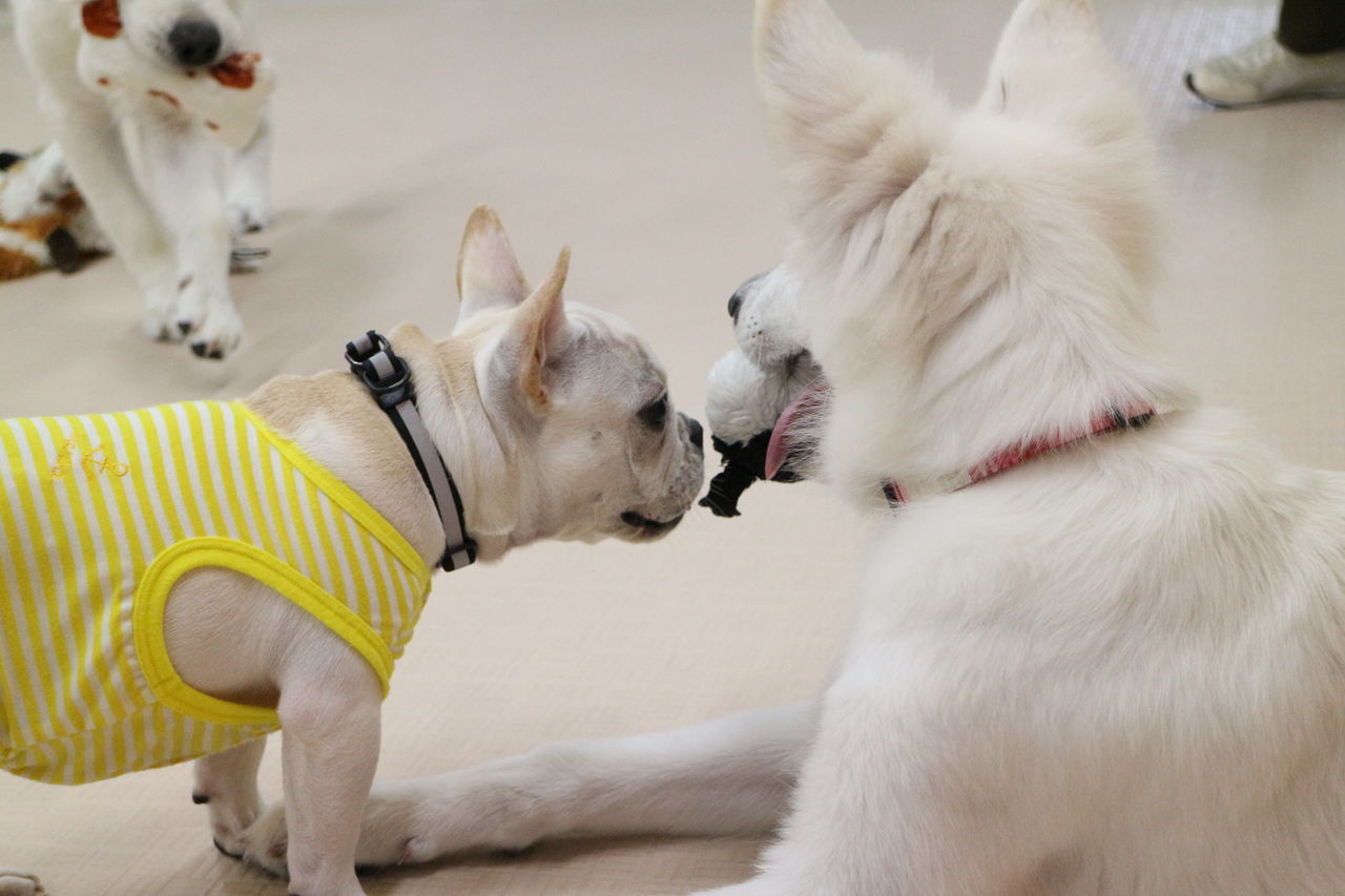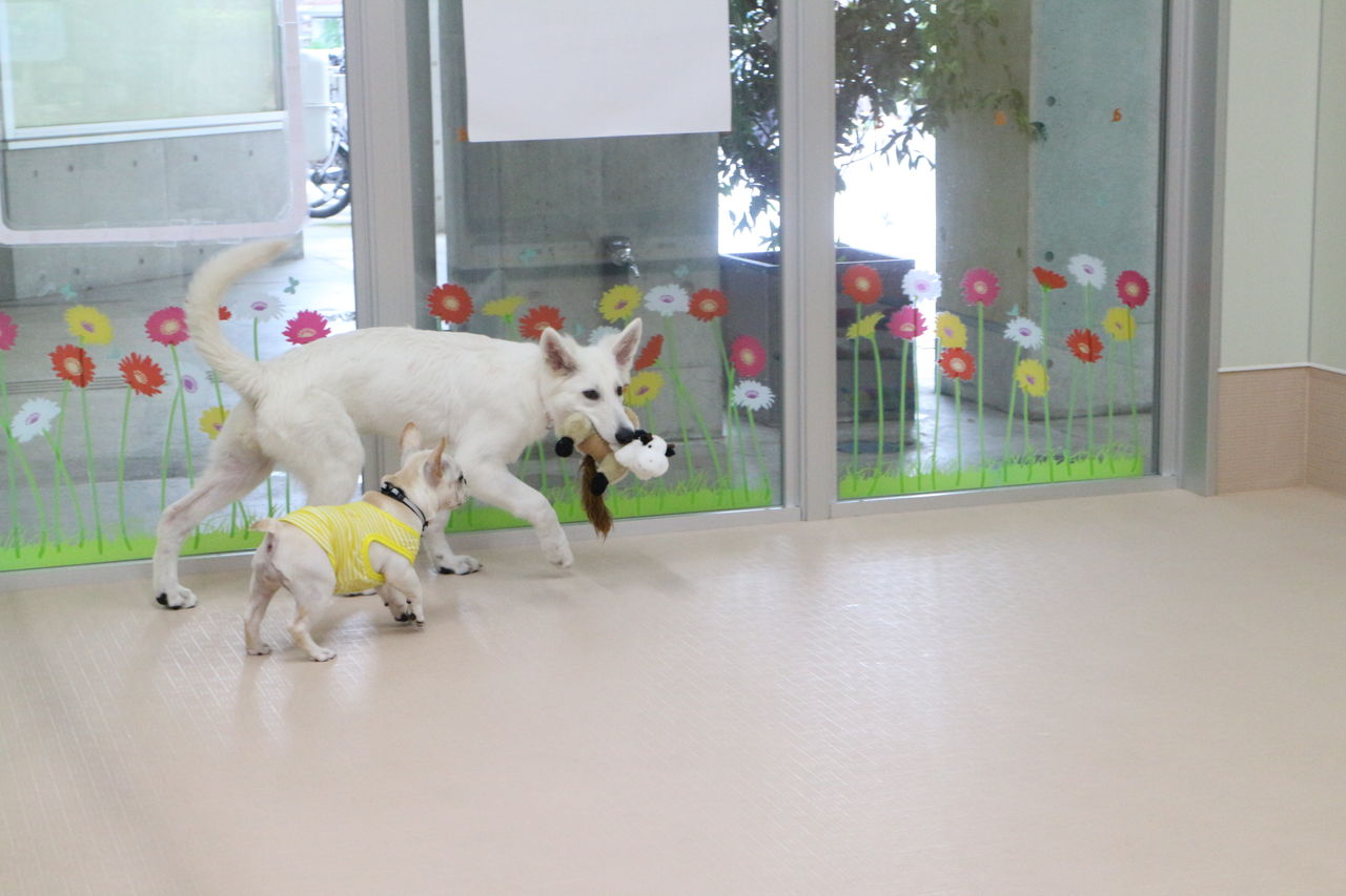 まずはスタッフが慎重にお互いのご挨拶をリードします。よし、大丈夫と判断して初めて一緒に遊ばせます。
